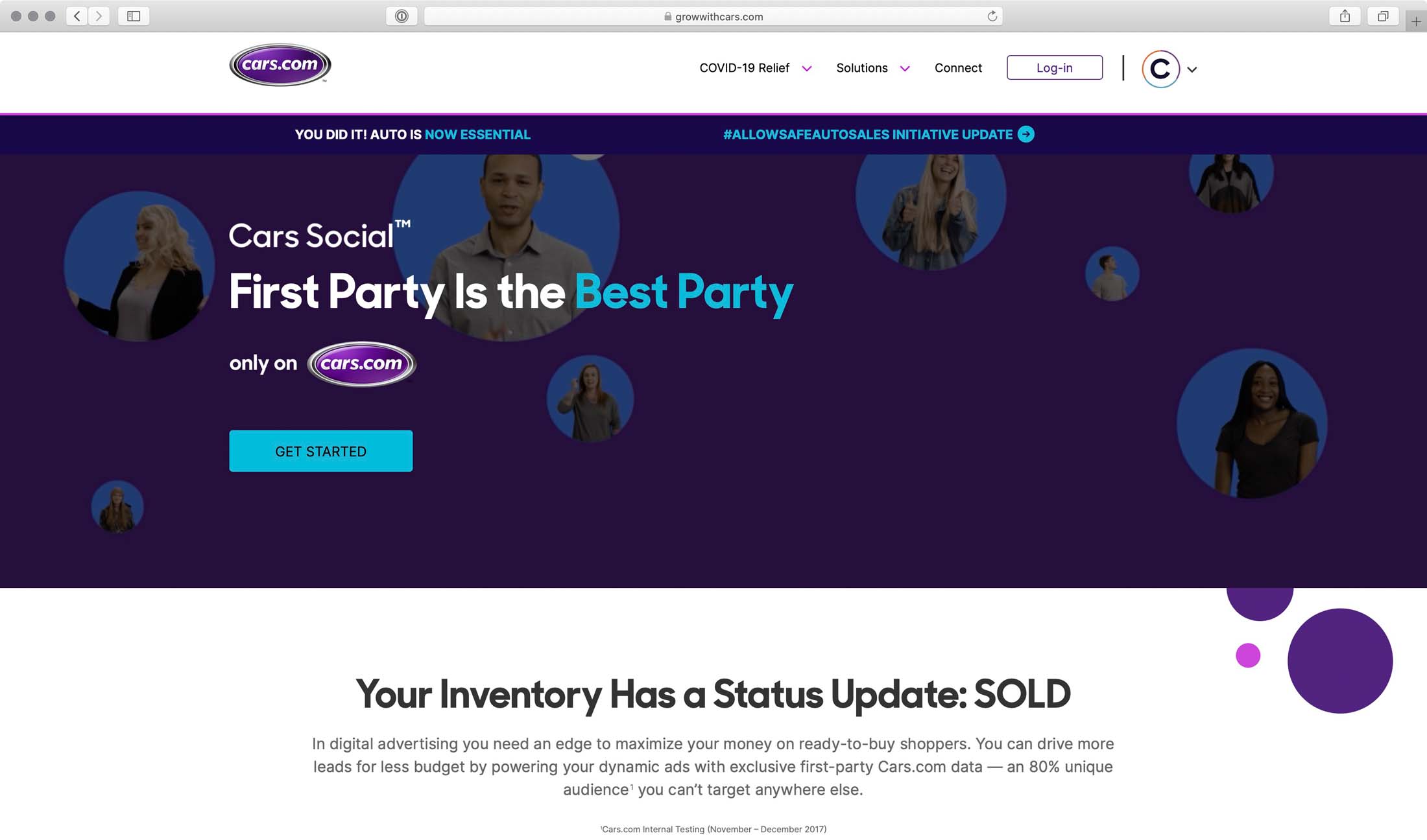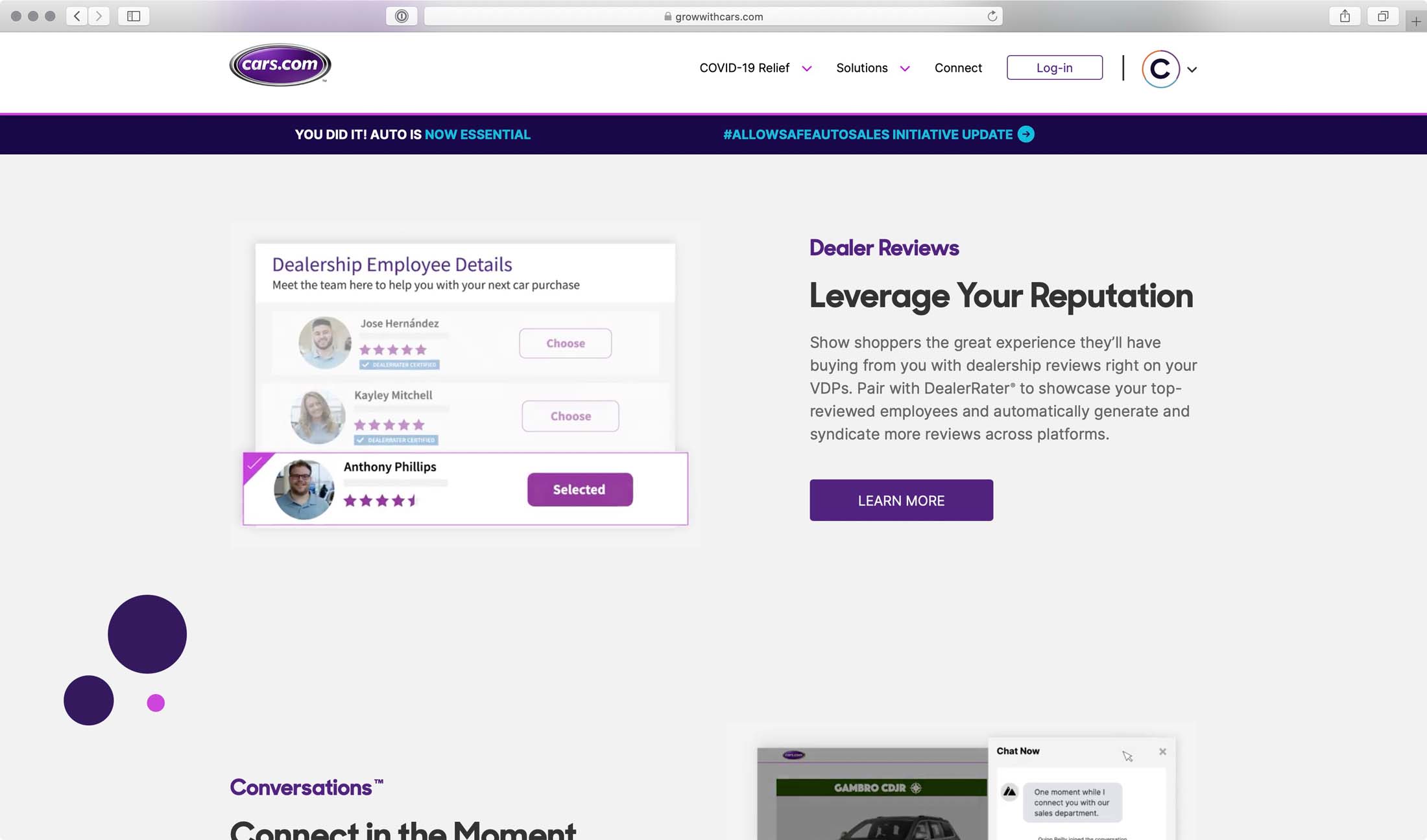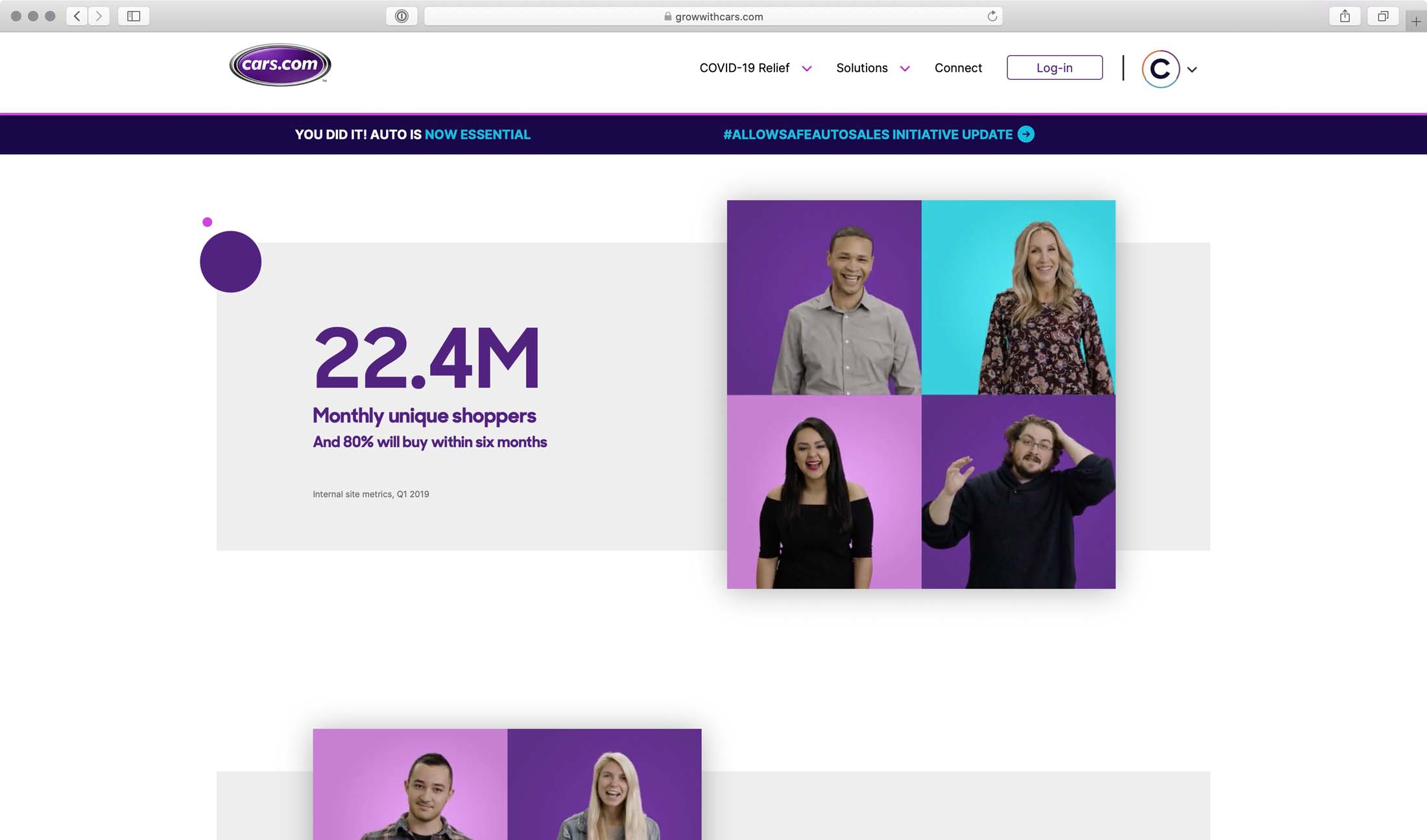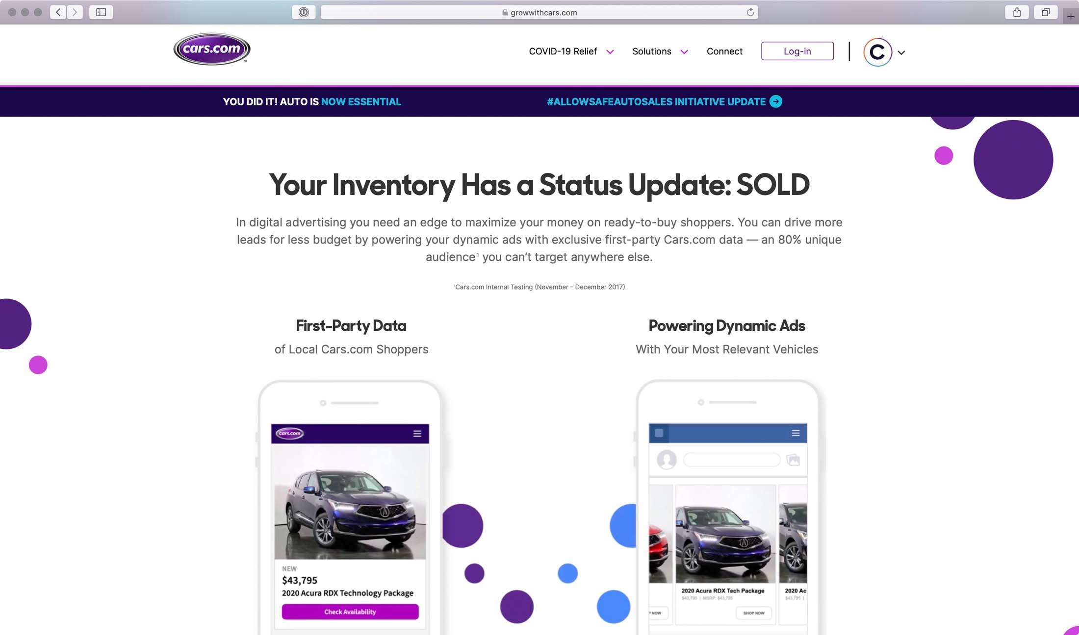 A refreshed marketing website for Cars.com line of service products they offer. This website includes many animated items triggered by scroll position. It is a very media rich site with many videos embedded throughout the site.