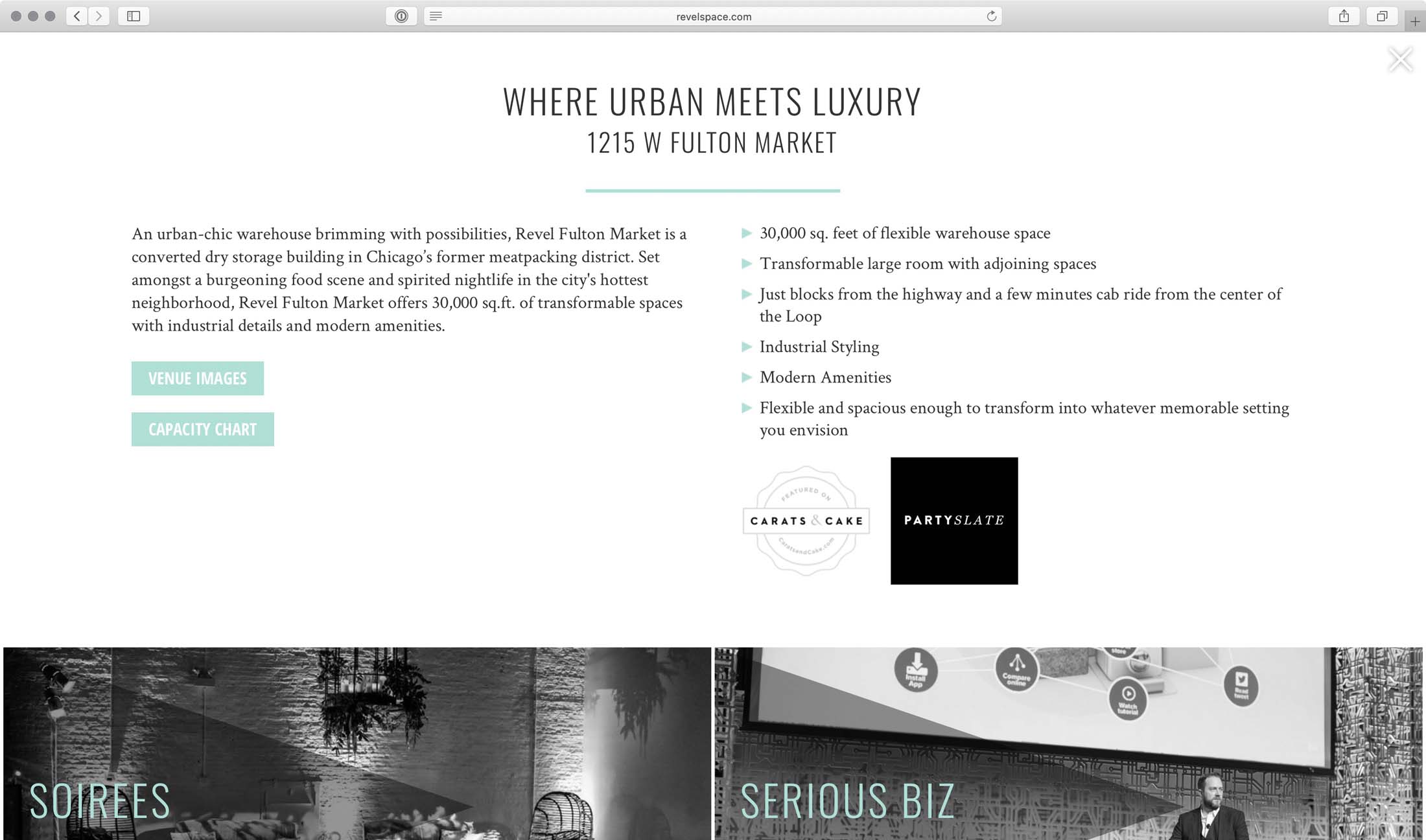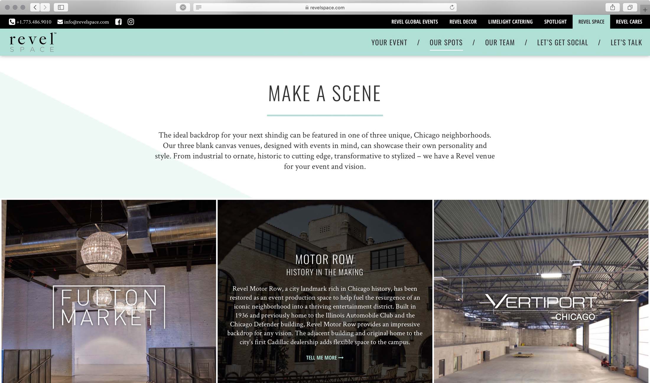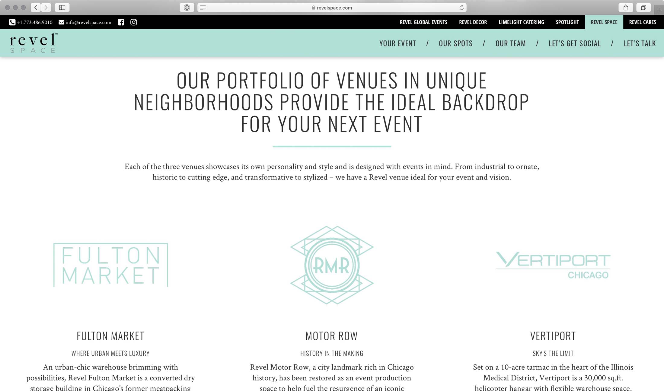 Web design and development project for The Revel Group’s Event Venue brand that has multiple locations. Featuring a clean look and allowing visitors to navigate multiple paths to find the venue space they are looking for.